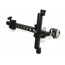 Прицел для блочного лука имеет 3 пина. Прицел может использоваться как на леворуких луках, так и на праворуких. Прицел имеет дополнительные отверстия для установки кивера. Для максимально точной настройки прицел имеет риски. Регулировка прицела может осуществляться по вертикали и по горизонтали.