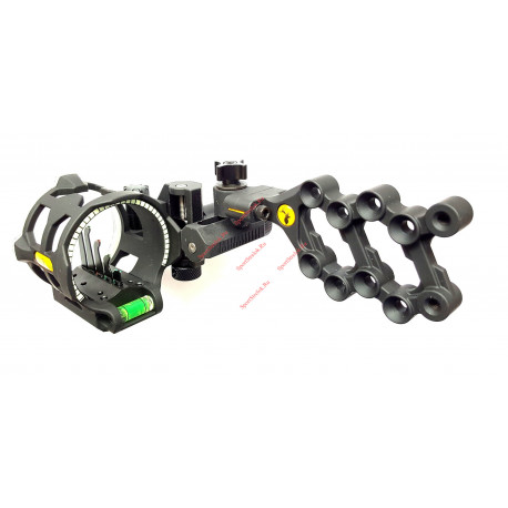 Прицел для блочного лука Trophy Ridge React V5 имеет вертикальное расположение пинов, что подойдет для стрельбы на дальние и сверхдальние дистанции. Данный прицел включает в себя технологию подстройки пинов "React", которая автоматически расставляет пины при пристрелке первых двух на расстояние 18 и 27 метров (20 и 30 ярдов соответственно). Система подстраивает остальные на расстояния 37, 46 и 55 метров (40, 50, 60 ярдов).